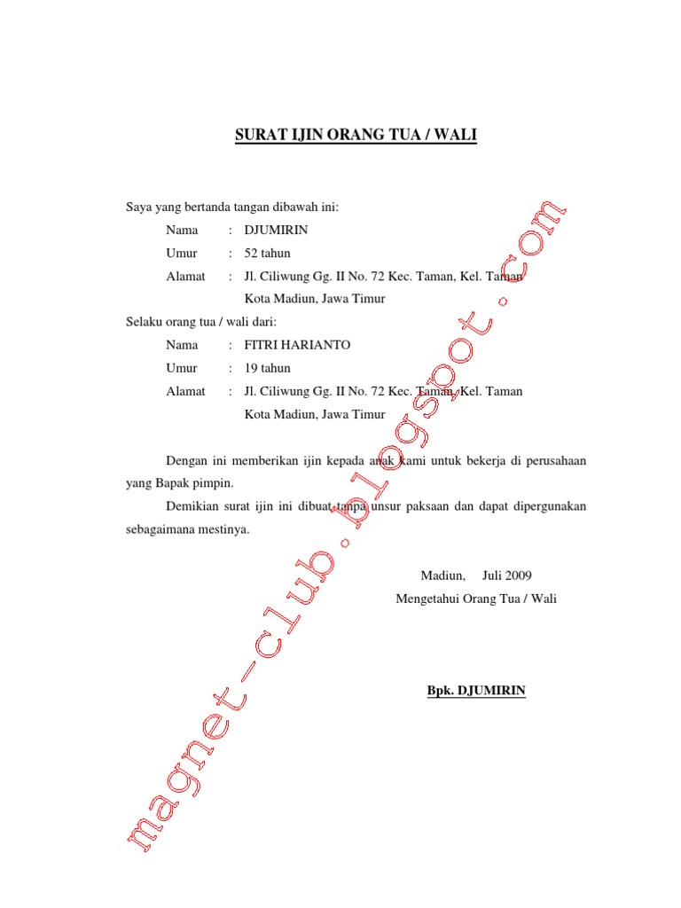 Dec 10, 2020 · contoh surat izin orang tua untuk melamar kerja jika kamu melamar kerja di suatu perusahaan dan diterima, biasanya pihak perusahaan akan meminta surat dari orang tua. Contoh surat izin orang tua untuk bekerja di perusahaan apabila anda tetap sabar, dan bersikap dewasa, mereka pasti akan mengizinkan anda untuk bekerja di perusahaan tersebut. Bagaimana cara membuat surat izin orang tua? Contoh surat izin orang tua. Biasanya surat tersebut berisikan pernyataan dari orang tua yang memberikan izin kepada anaknya untuk ikut dalam kegiatan tersebut dan tanggung jawab seutuhnya dipasrahkan.